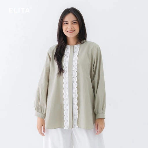- Detail tanpa kerah dengan tambahan renda pada bagian depan yang membuat manis & statment looknya