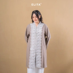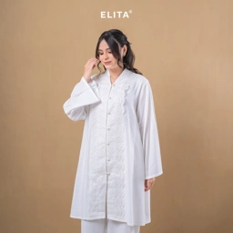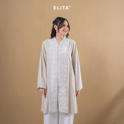 - Bukaan depan dengan dilengkapi renda dekoratif yang memanjang secara vertikal dari area leher hingga bawah tunik memberikan tampilan yang lebih feminin serta elegan
